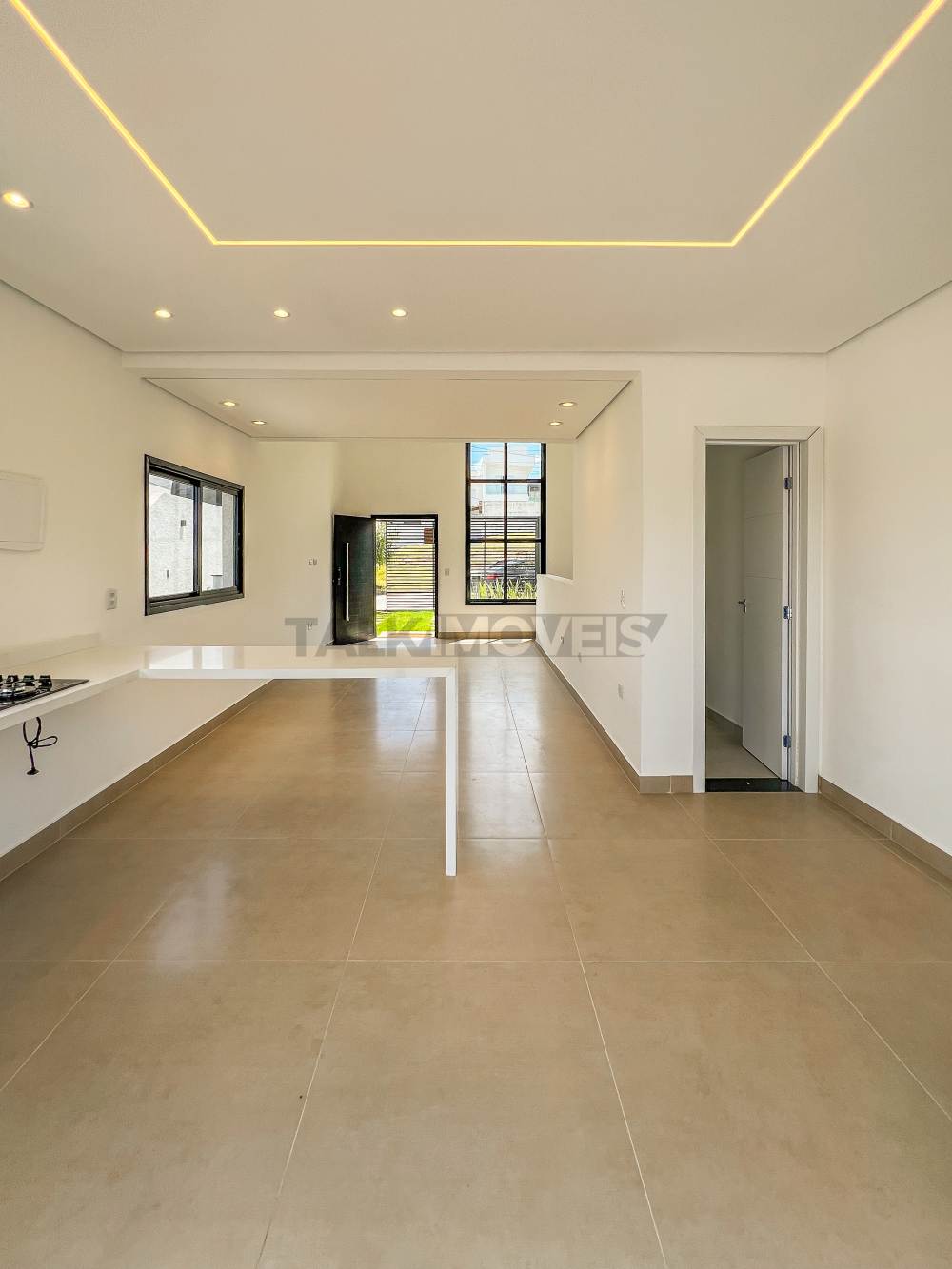 Cozinha em granito branco prime com cooktop, torneira e cuba gourmet
