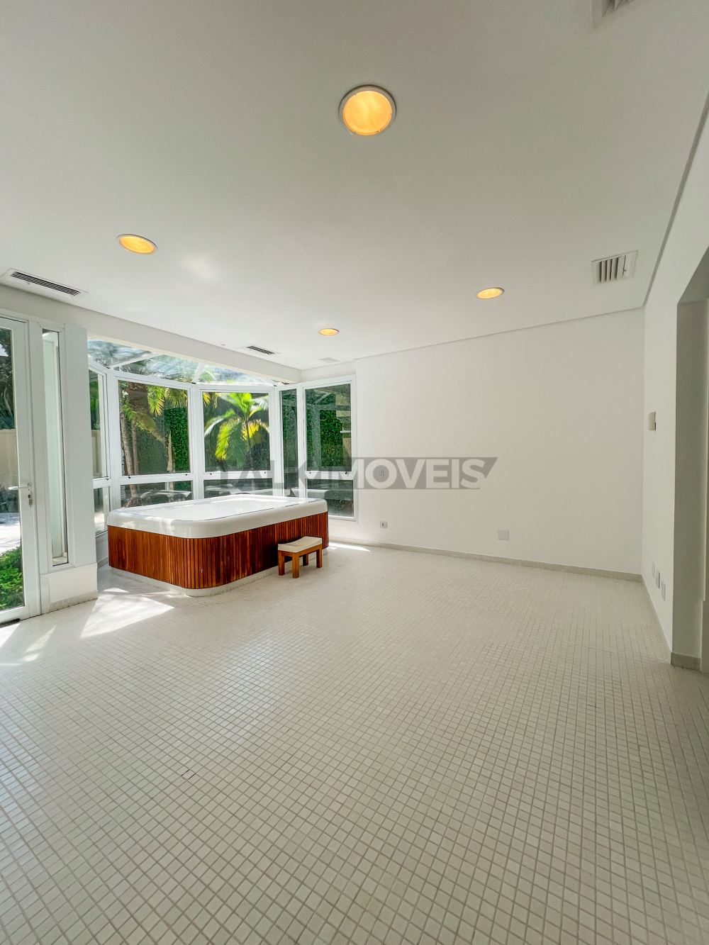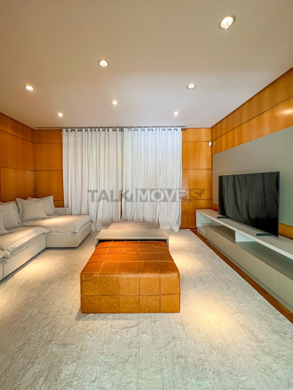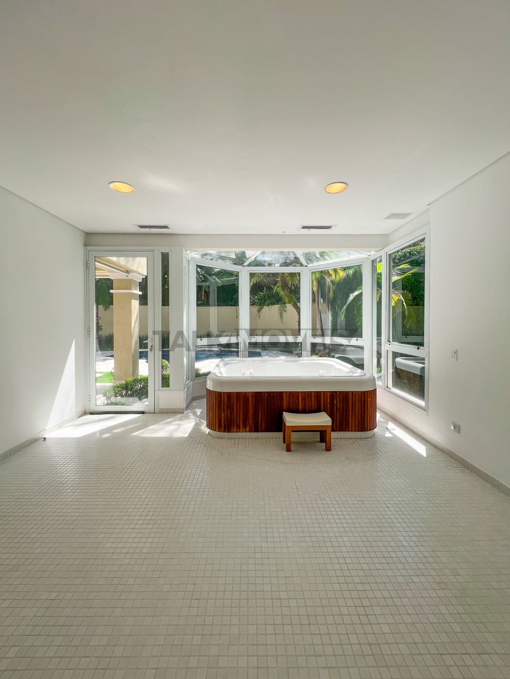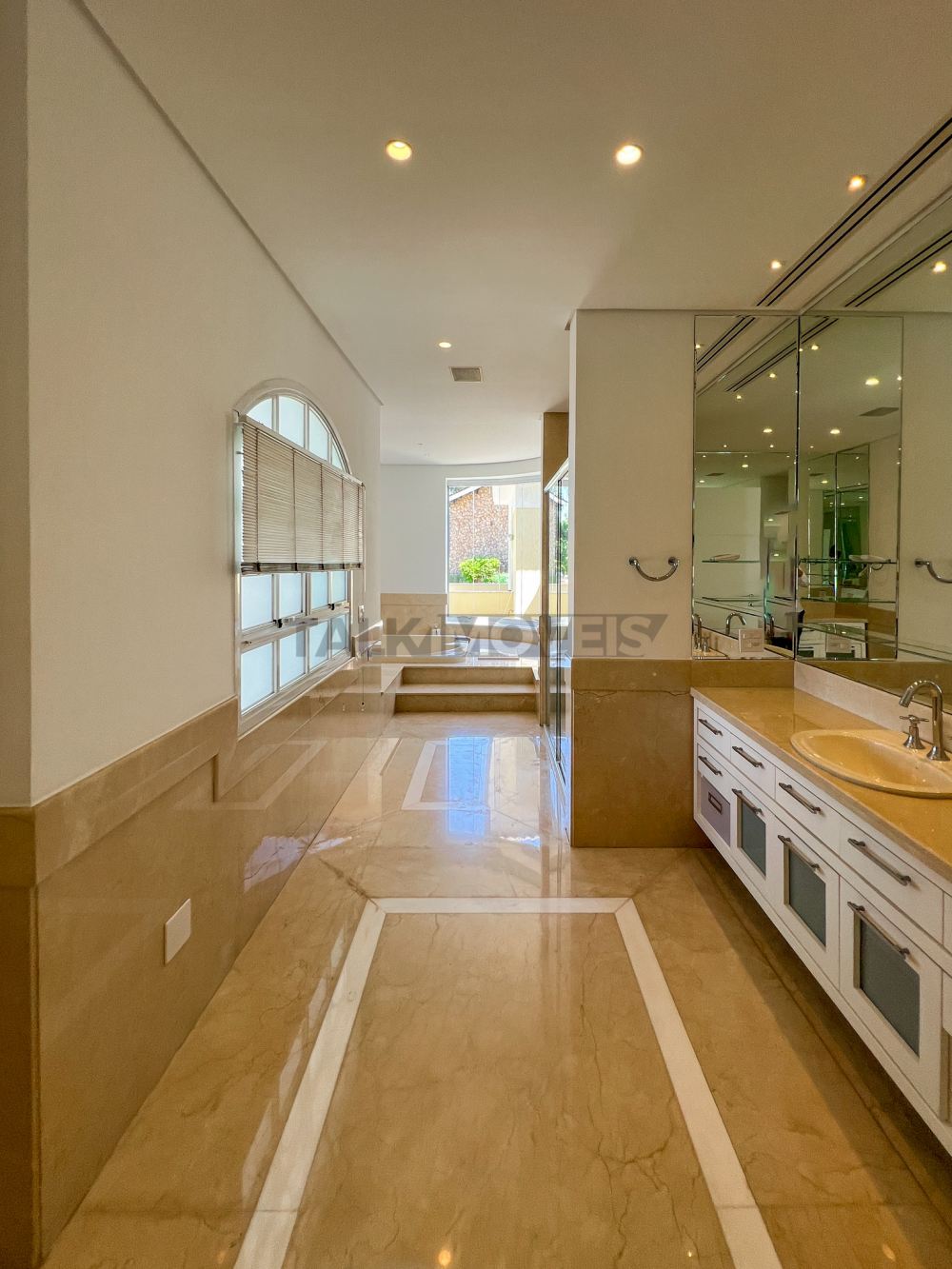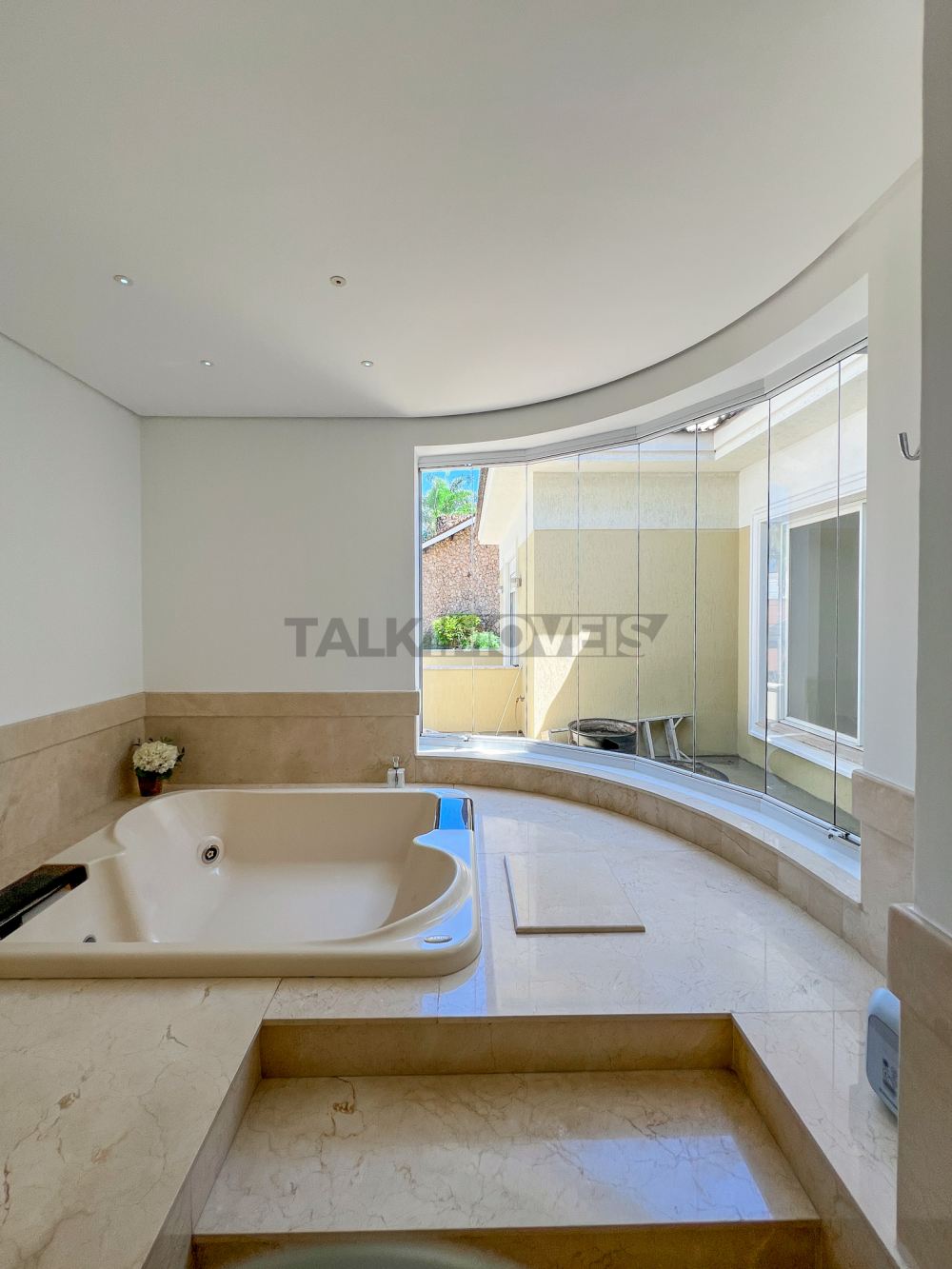 Suíte master com sala íntima, closet Sr e Sra, banheiro com hidromassagem, dois chuveiros, duas pias e roupeiro.