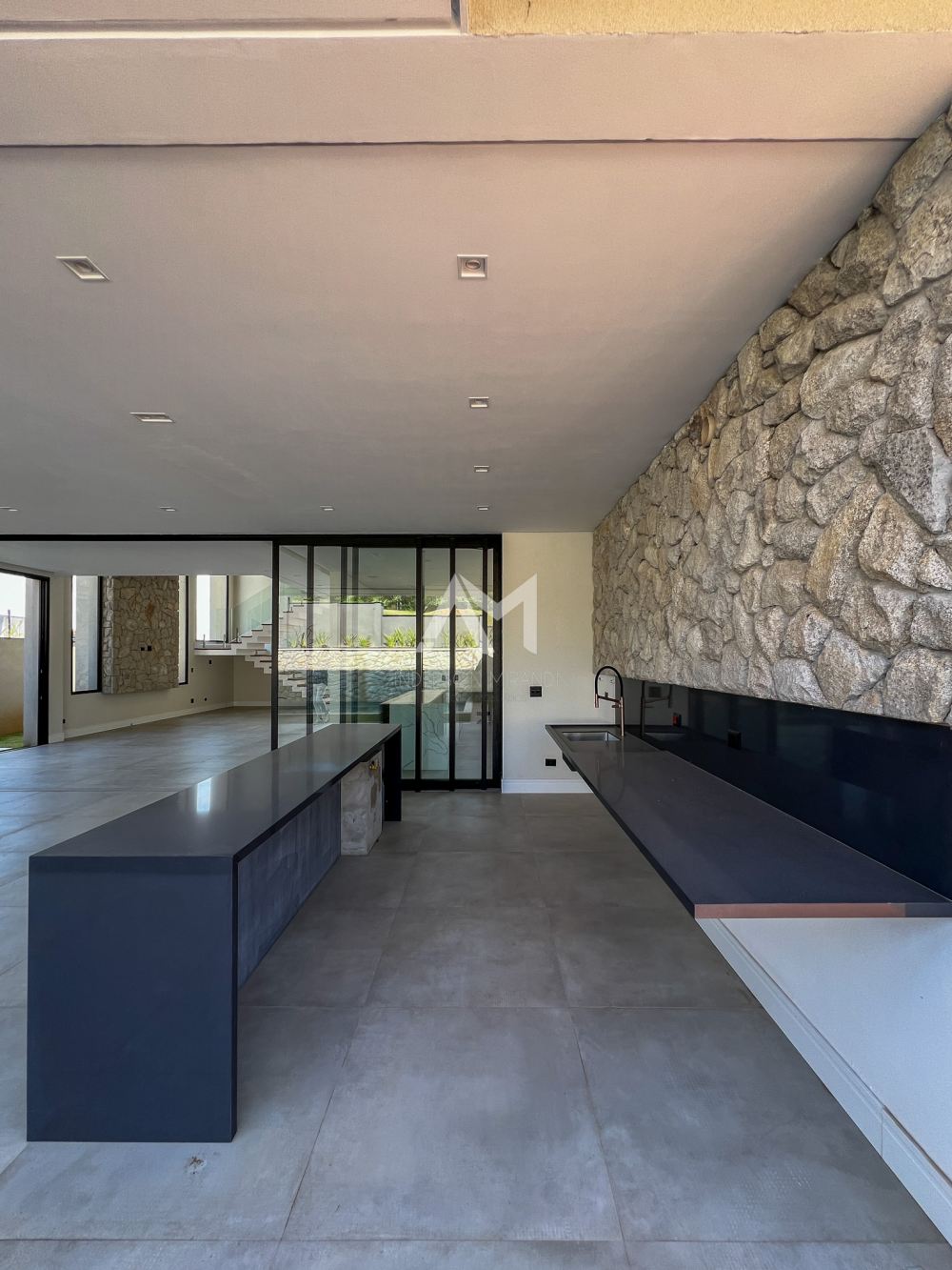 Possui uma agradável área de churrasco, bancada, integrada a piscina