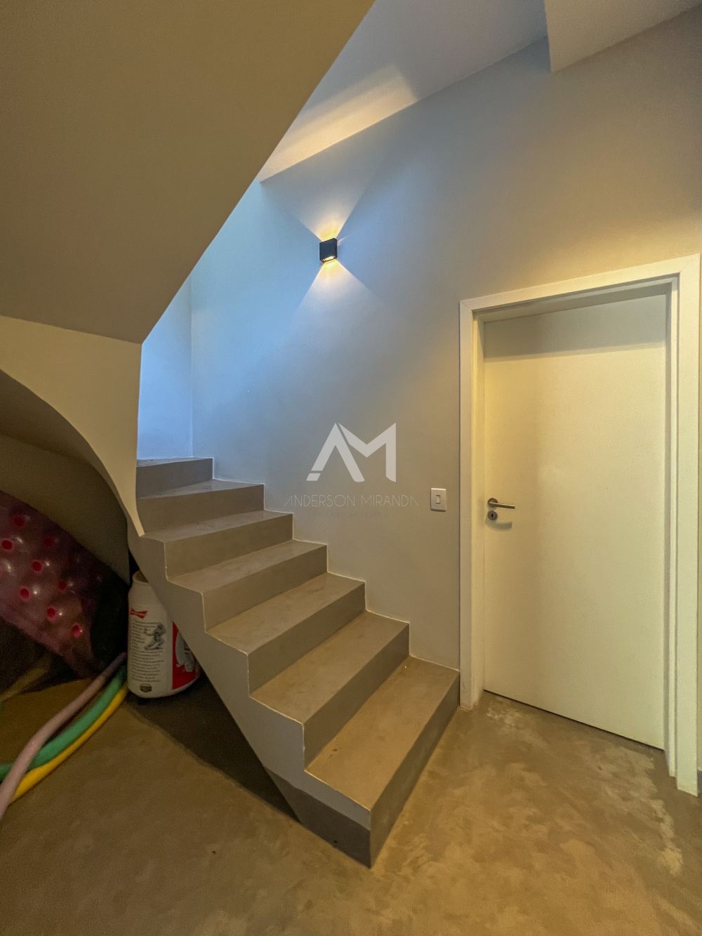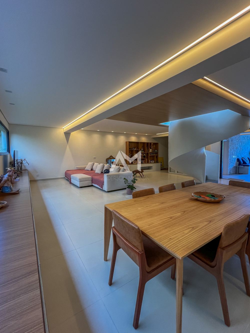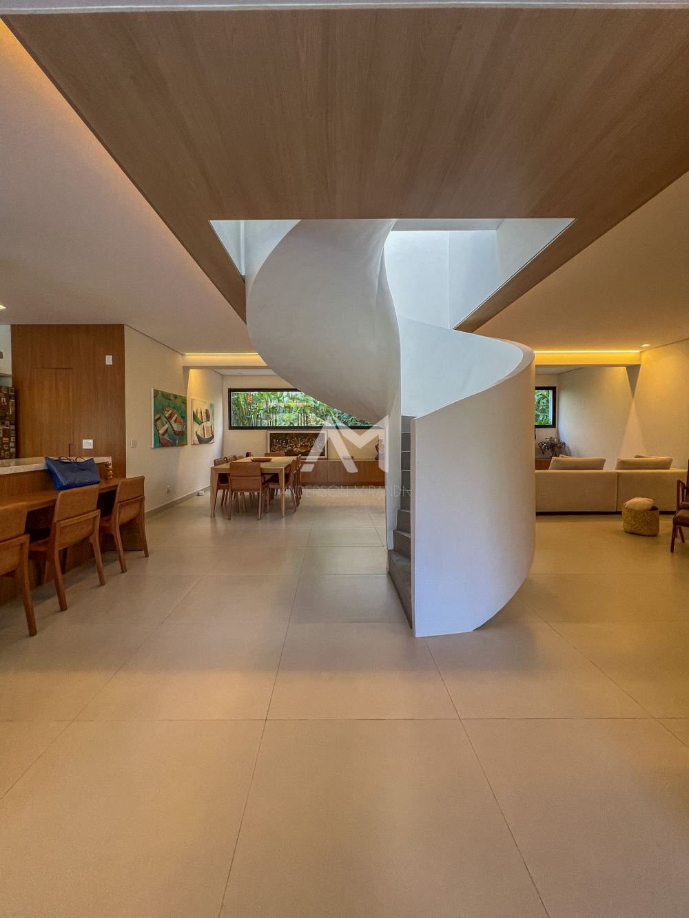 A escada helicoidal faz parte da arquitetura, trazendo charme e elegância ao imóvel