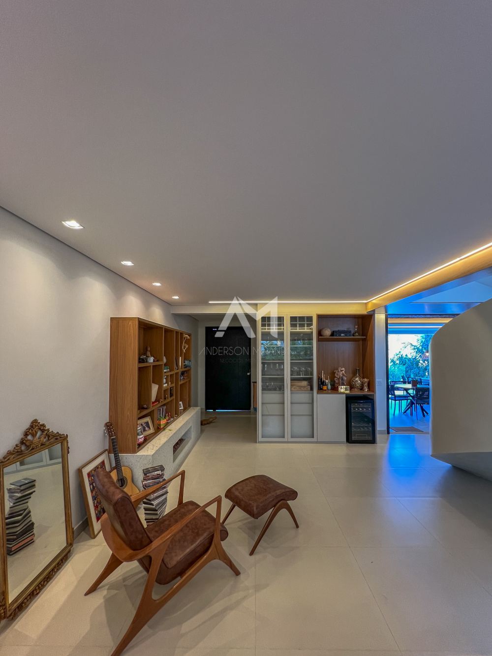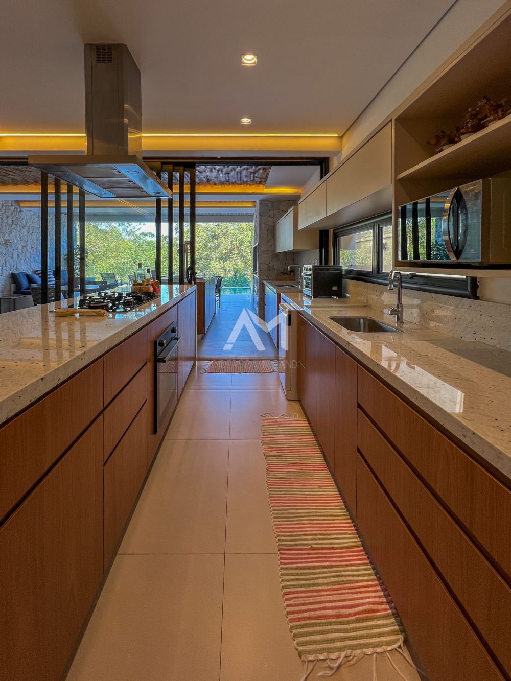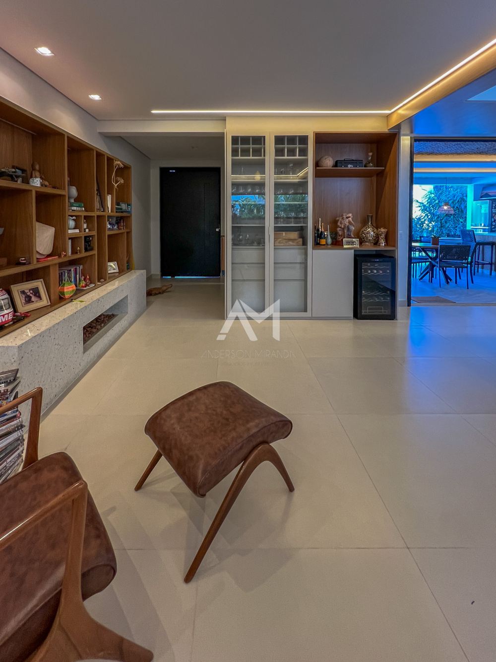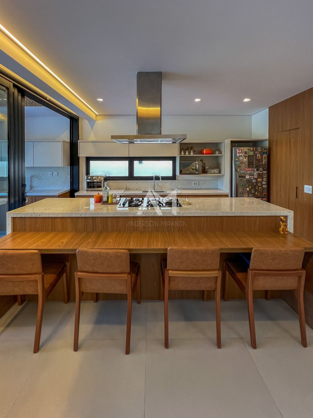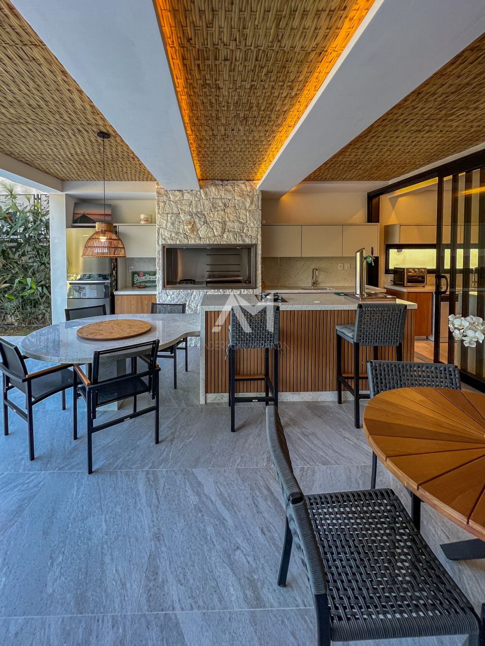 Living amplo com lareira e adega, totalmente integrado com o lazer e a área gourmet, com ilha , churrasqueira, chapa , Cooktop , chopeira e lavabo,