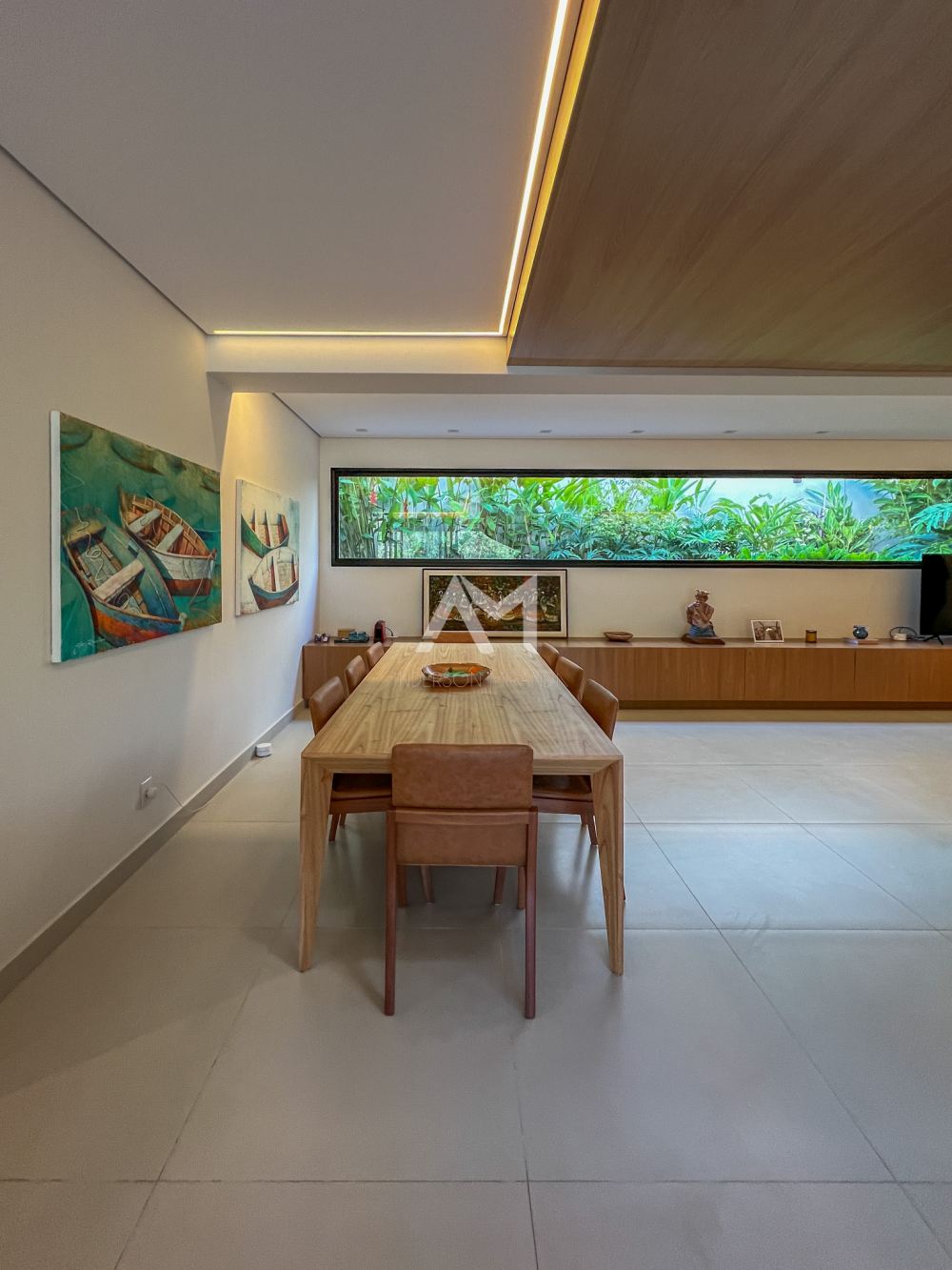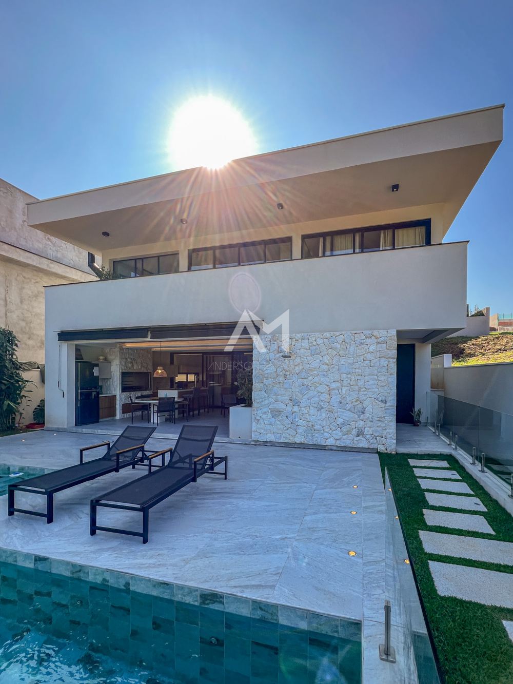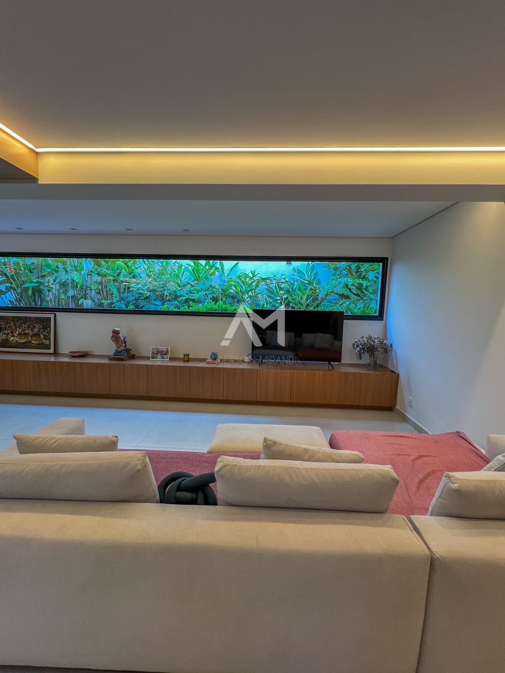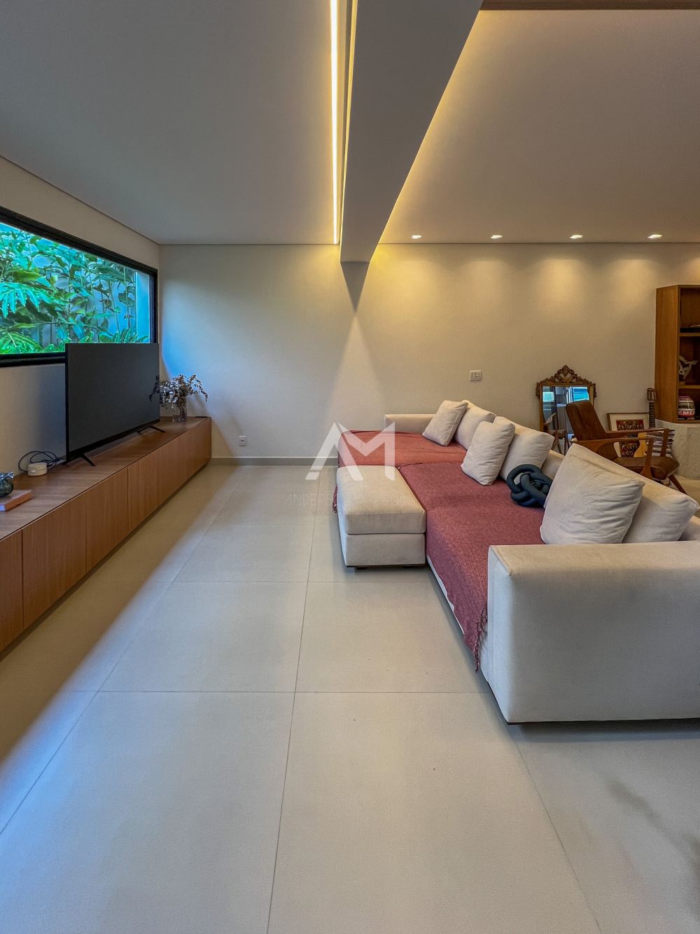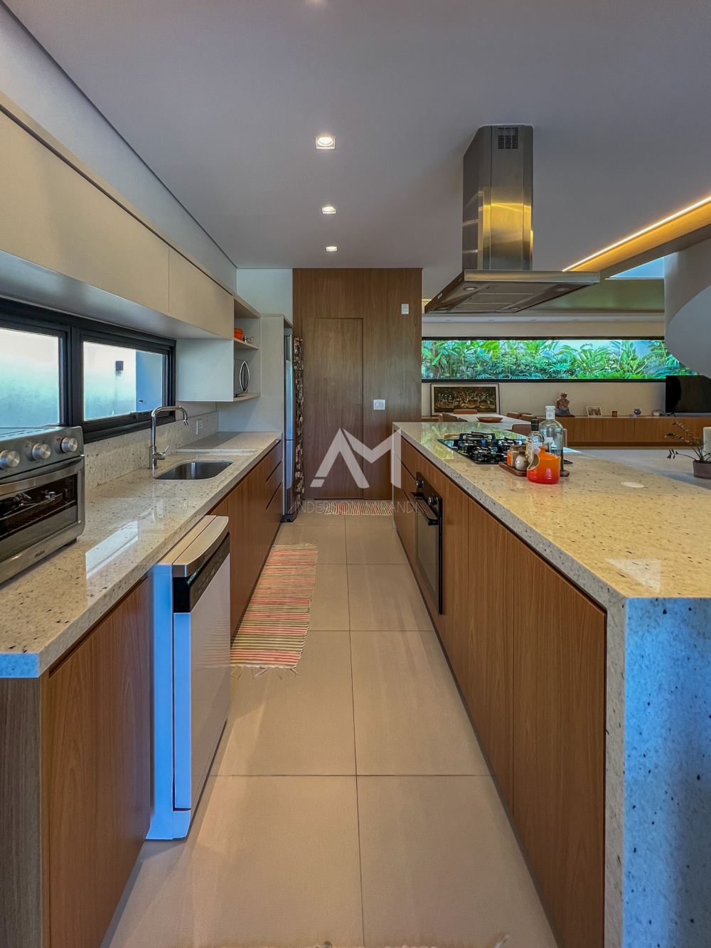 Living amplo com lareira e adega, totalmente integrado com o lazer e a área gourmet, com ilha , churrasqueira, chapa , Cooktop , chopeira e lavabo,