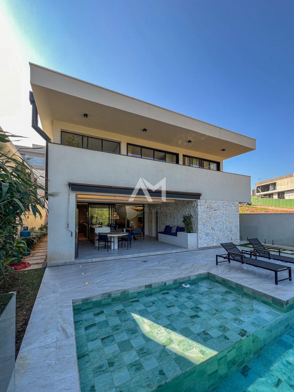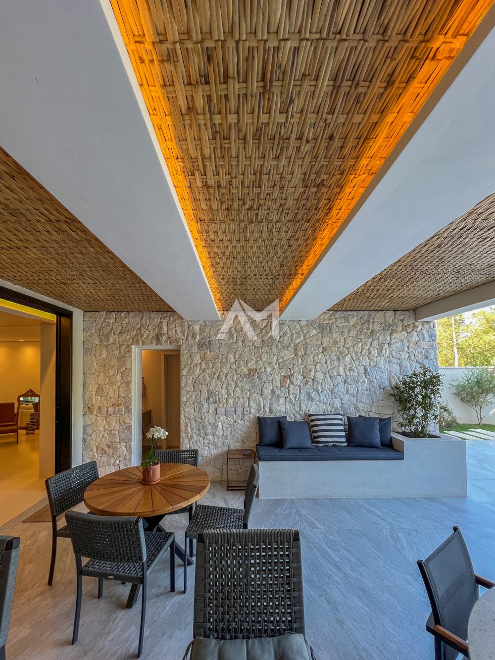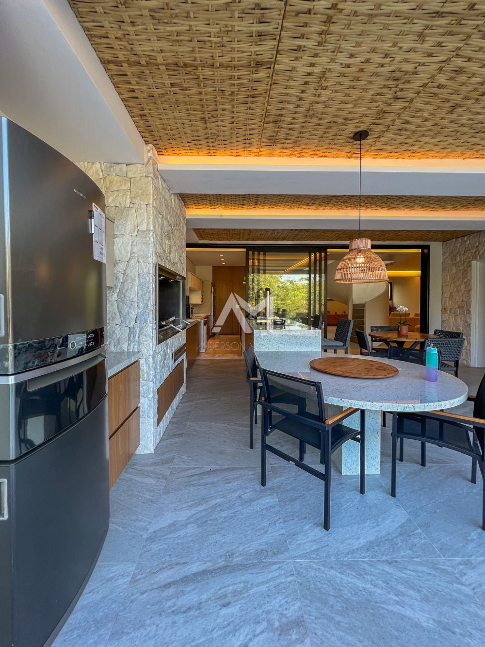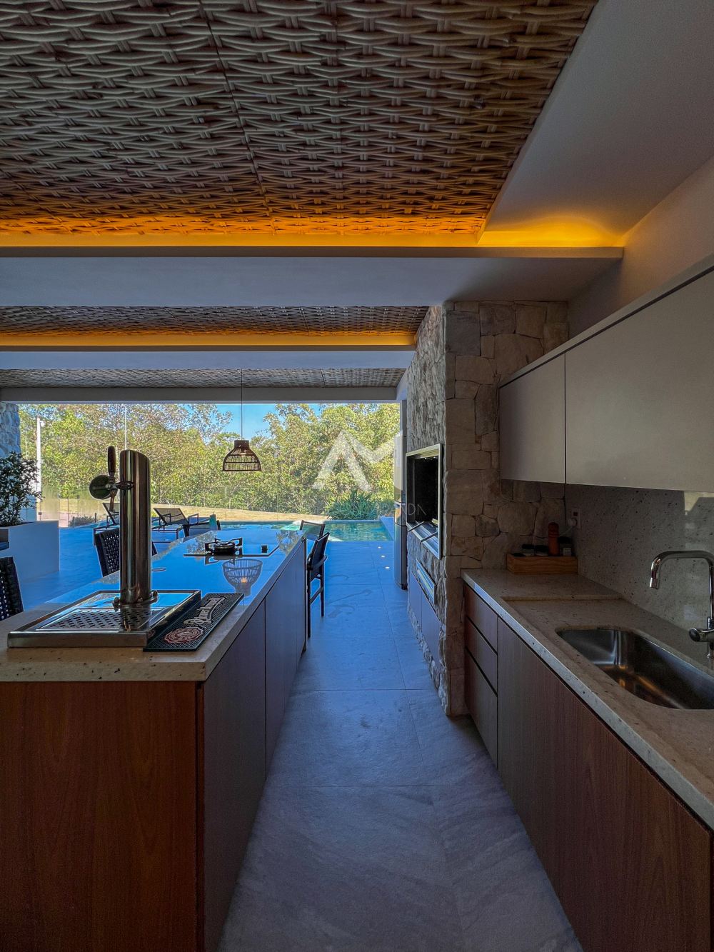 toda essa área foi cuidadosamente revestida em pedra moledo, fazendo um contraponto com a mesa e o balcão em mármore “…”